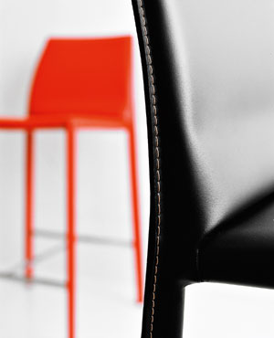 Erhöhter Barhocker/Stuhl für Tisch undTheke. Das Gestell aus Metall ist mit Kunstleder überzogen. Verfügbare Farben: orange, grün, weiss, schwarz, rot und dunkelbraun.