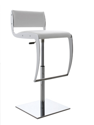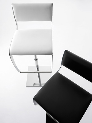 Hocker für Tisch und Theke mit Stahlstruktur, verchromt, System UP & DOWN von 76 cm auf 53 cm Lederbezogen in den Farben weiß und schwarz.